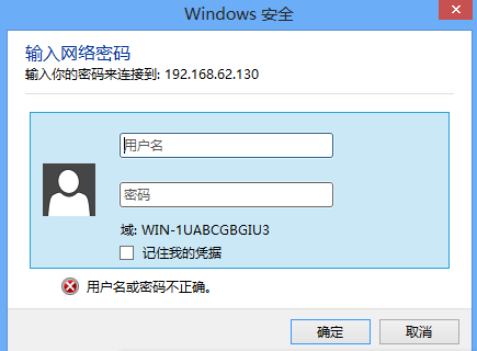 客户服务尝试连接到服务器。为了演示方便,通过界面操作,地址栏直接输入\\192.168.62.130,弹出框提示用户名和密码不正确,如下图所示。